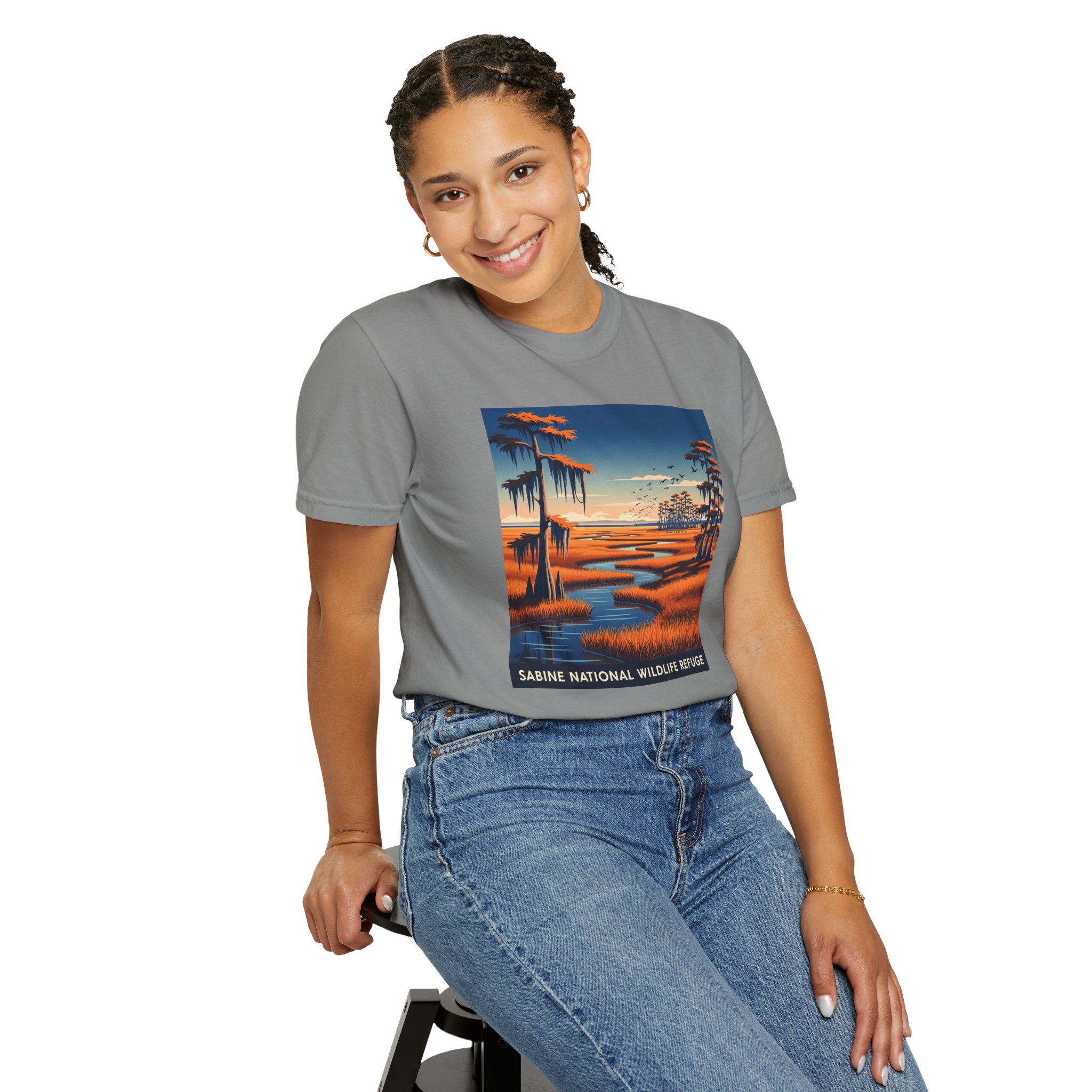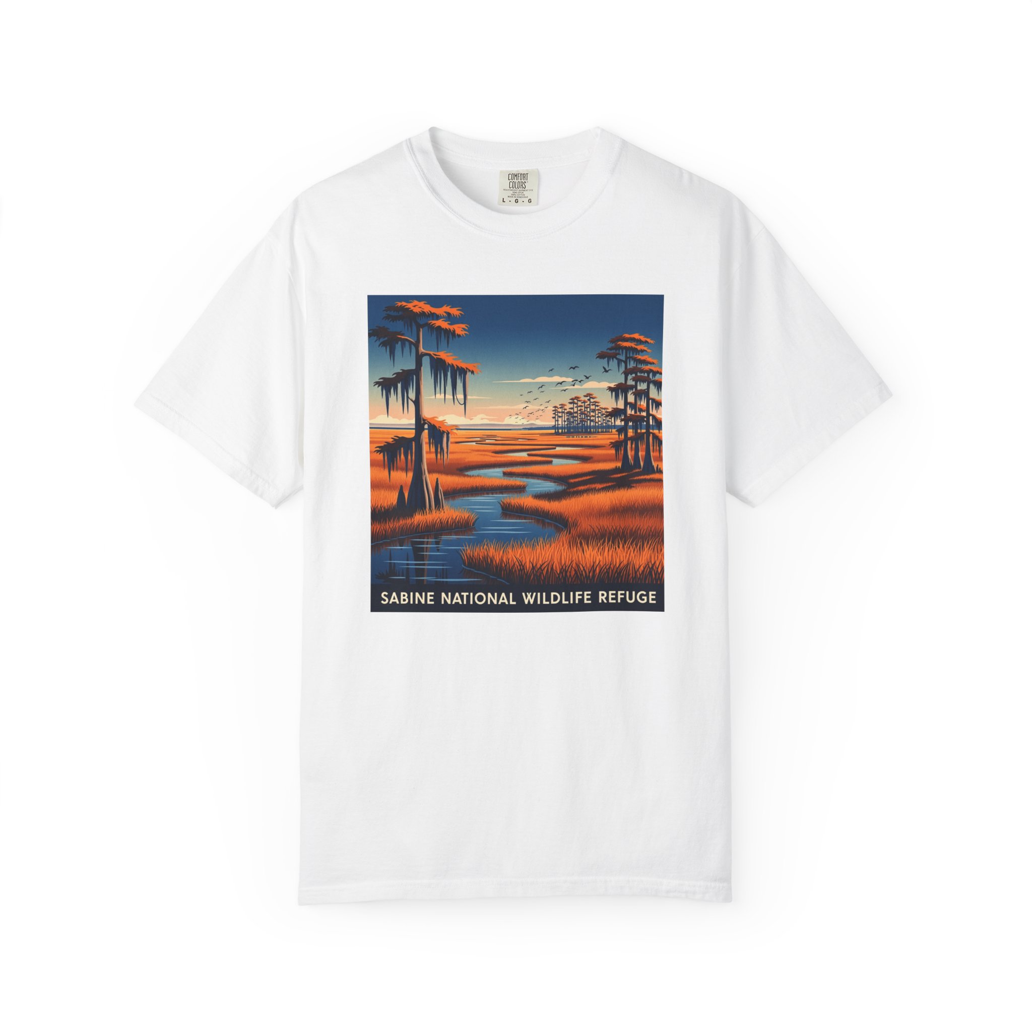 124,000 acres of coastal marsh on the Chenier Plain. Alligators in every canal. The mosquitoes somehow bite through your shirt in July. America’s design golden age on a tee.